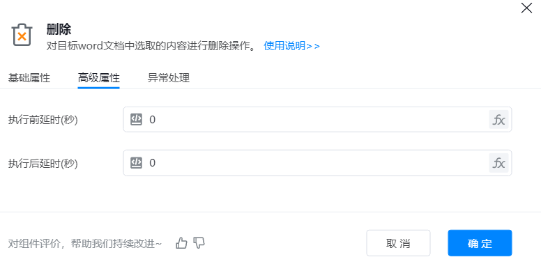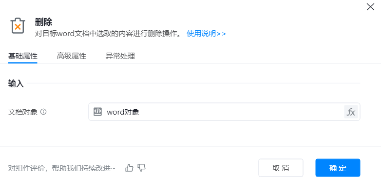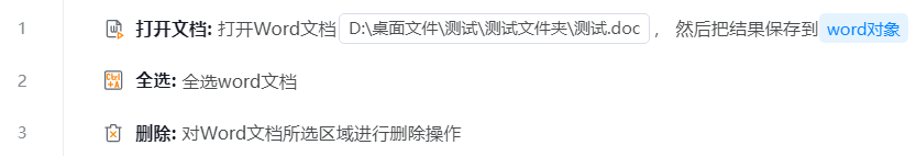 ● 文档对象 :待操作的Word文档对象,可使用【打开文档】等组件返回的变量。