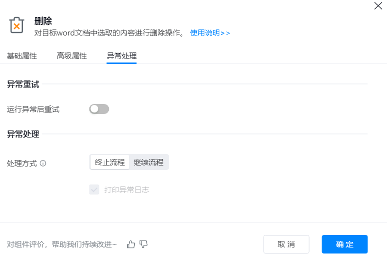● 异常重试:当流程运行过程中发生异常时,可根据实际需求配置是否启用重试逻辑。