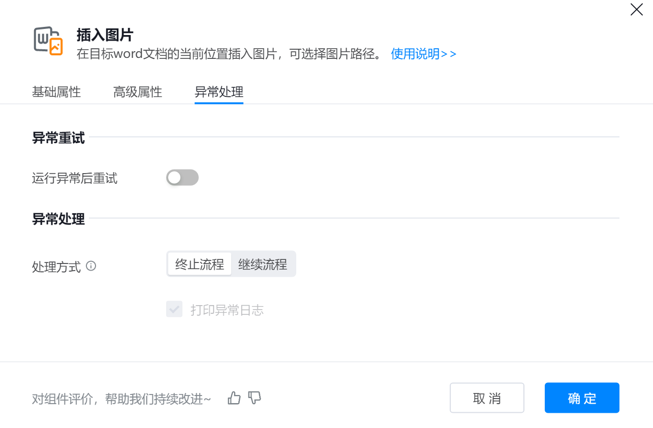● 异常重试 :当流程运行过程中发生异常时,可根据实际需求配置是否启用重试逻辑。