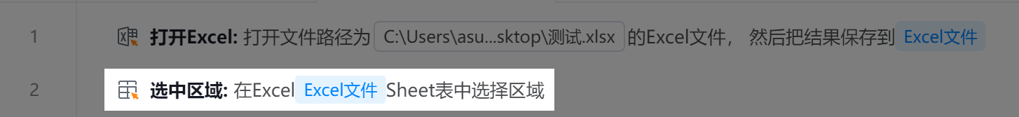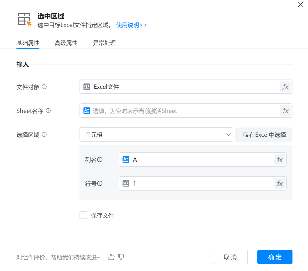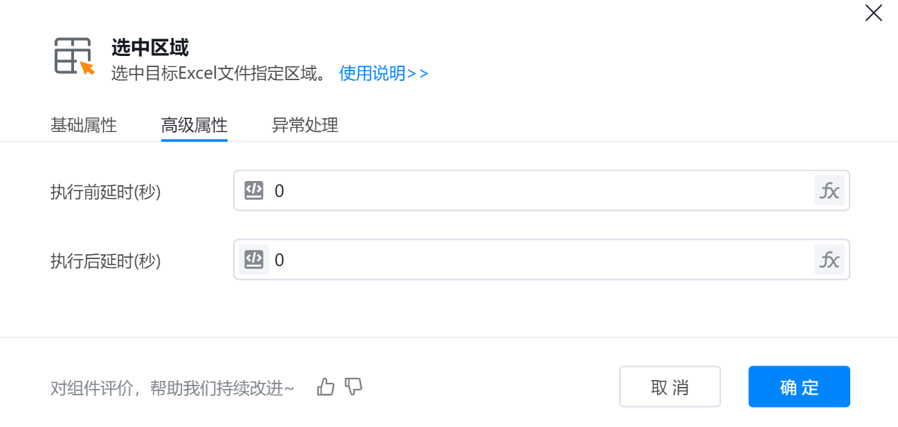 组件用于在Excel文件中通过指定行号、列名或表达式(如"A1:C3")精准选取目标单元格范围,支持普通模式(手动输入起止位置)和高级模式(直接输入表达式),并可选择操作后是否保存文件。