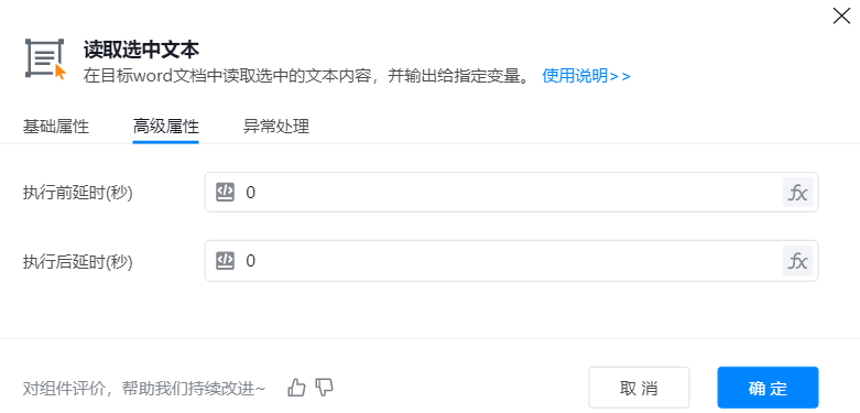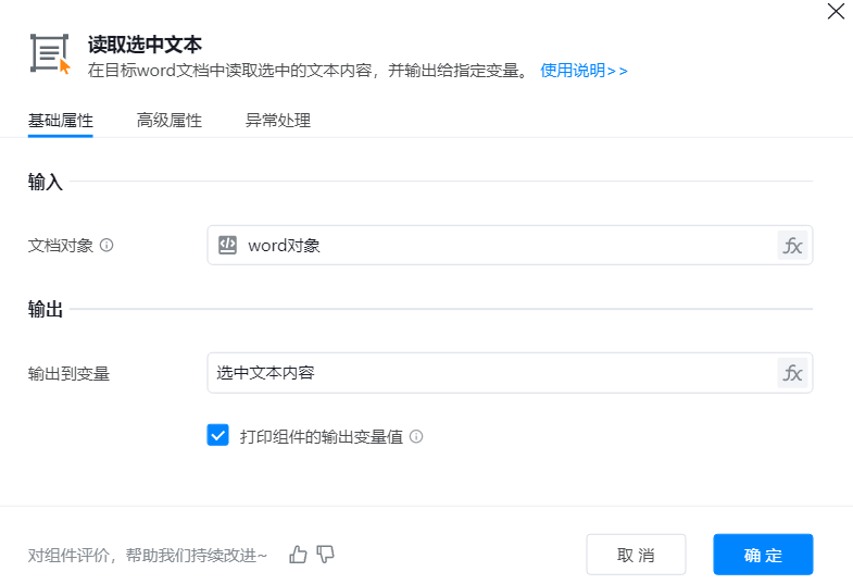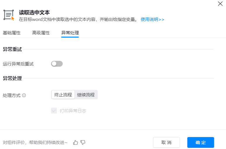 ● 输出到变量:将组件运行读取到的内容,输出到变量,以便在后续步骤中动态获取和使用这些信息。