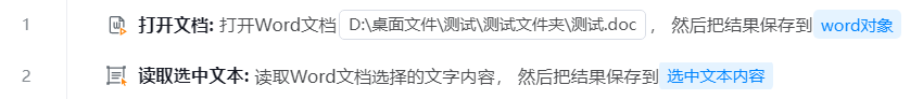 1. 使用【打开文档】组件打开一个Word对象;