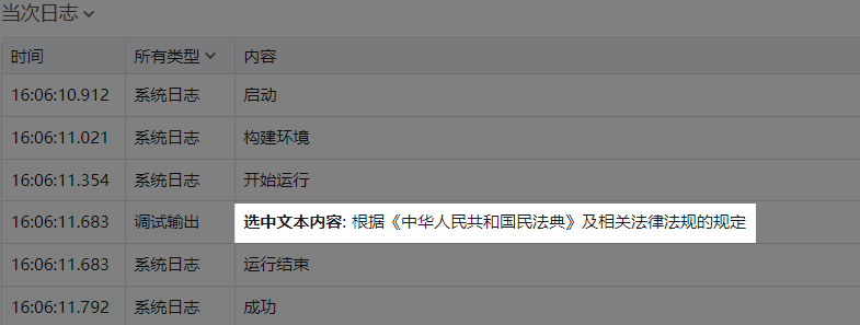 2. 选择内容,然后使用【读取选中内容】组件读取,输出结果。