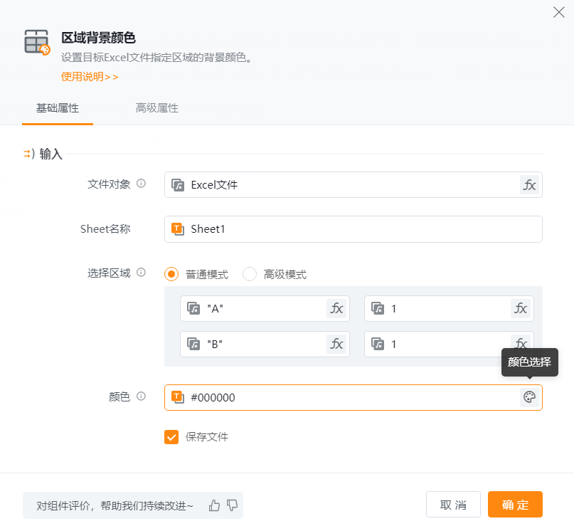 ● 颜色:待设置区域的背景色,支持可视化的拾取方式和设置RGB值的格式(如:[255,0,0])。