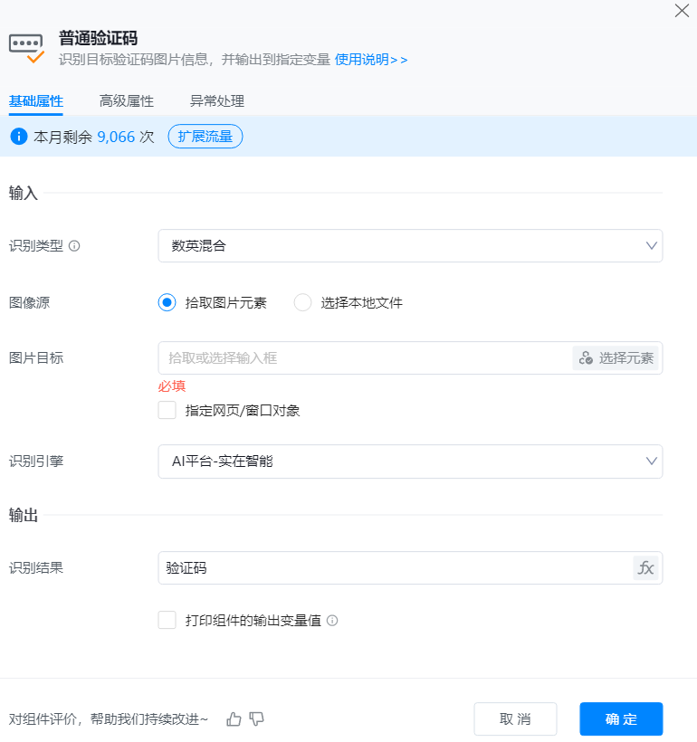 ● 识别引擎:根据验证码类型选择识别的引擎,可选择“AI平台-实在智能”或“AI平台-聚合平台”。