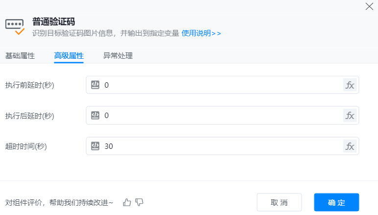 ● 识别结果:将识别后的验证码,输出至指定变量,以便在后续步骤中动态获取和使用这些信息。
