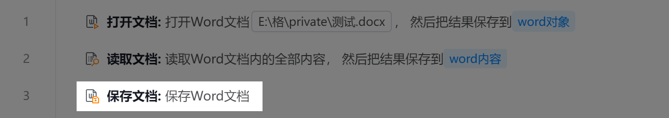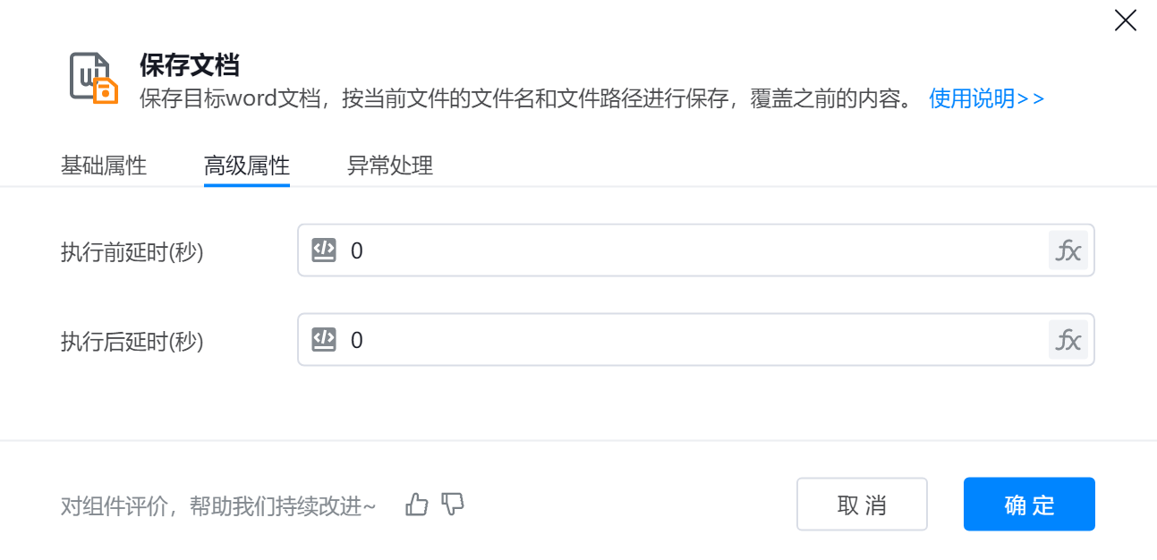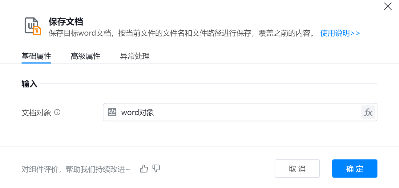 ● 文档对象 :代表要保存的Word文档对象,可以使用打开文档等组件返回的变量。