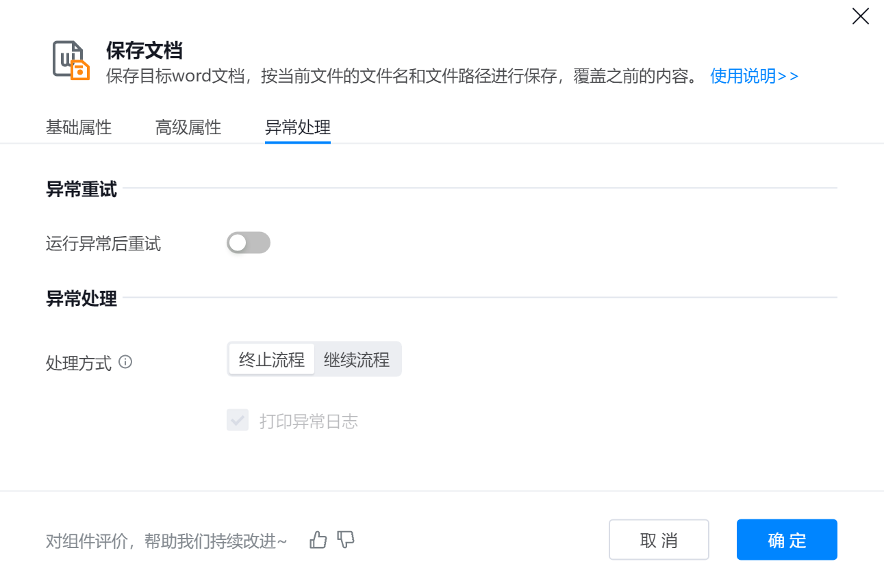 ● 异常重试 :当流程运行过程中发生异常时,可根据实际需求配置是否启用重试逻辑。