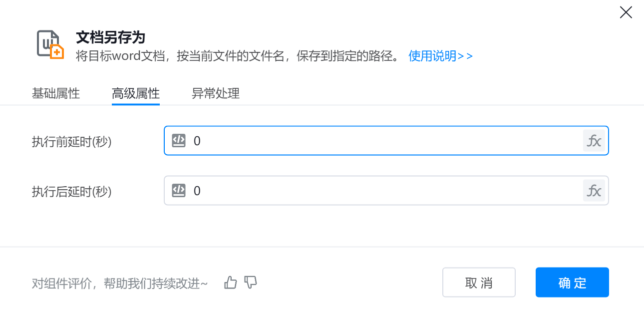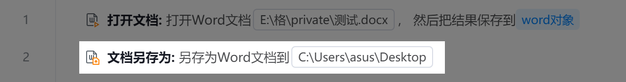 ● 文档对象 :待操作的Word文档对象,可使用”打开文档“等组件返回的变量。