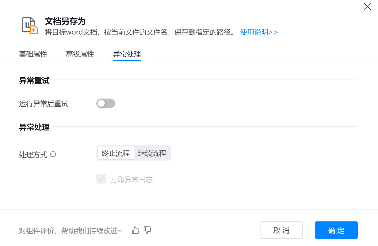 ● 异常重试 :当流程运行过程中发生异常时,可根据实际需求配置是否启用重试逻辑。