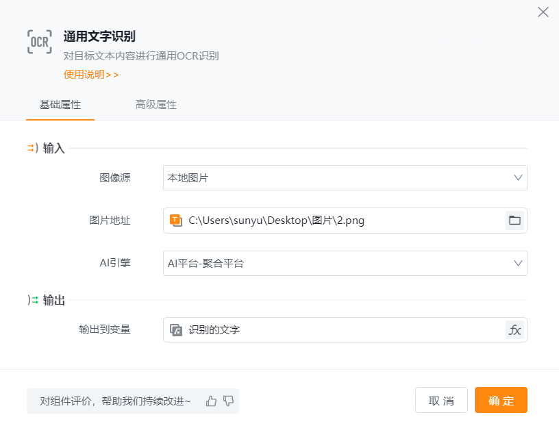● 图片地址/图片URL:指定期望识别的图片路径,可使用变量,建议使用常用的 jpg、jpeg 和 png图片格式。