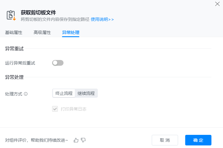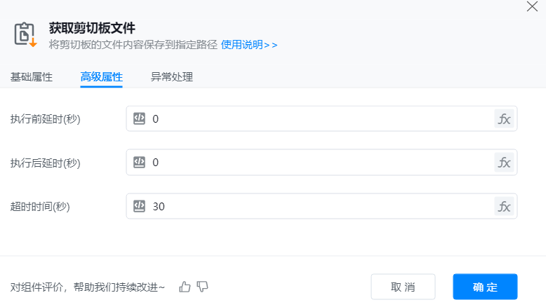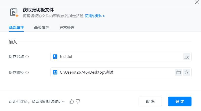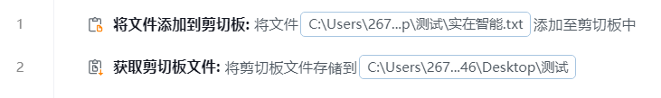 添加【获取剪切板文件】组件到可视化编辑区,并配置其基础属性。通常搭配【将文件添加到剪切板】一起使用。