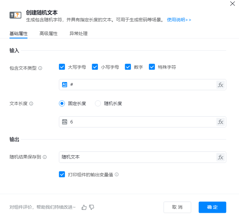 ● 随机结果保存到:将创建后的结果,输出并赋值到变量,以便在后续步骤中动态获取和使用这些信息。
