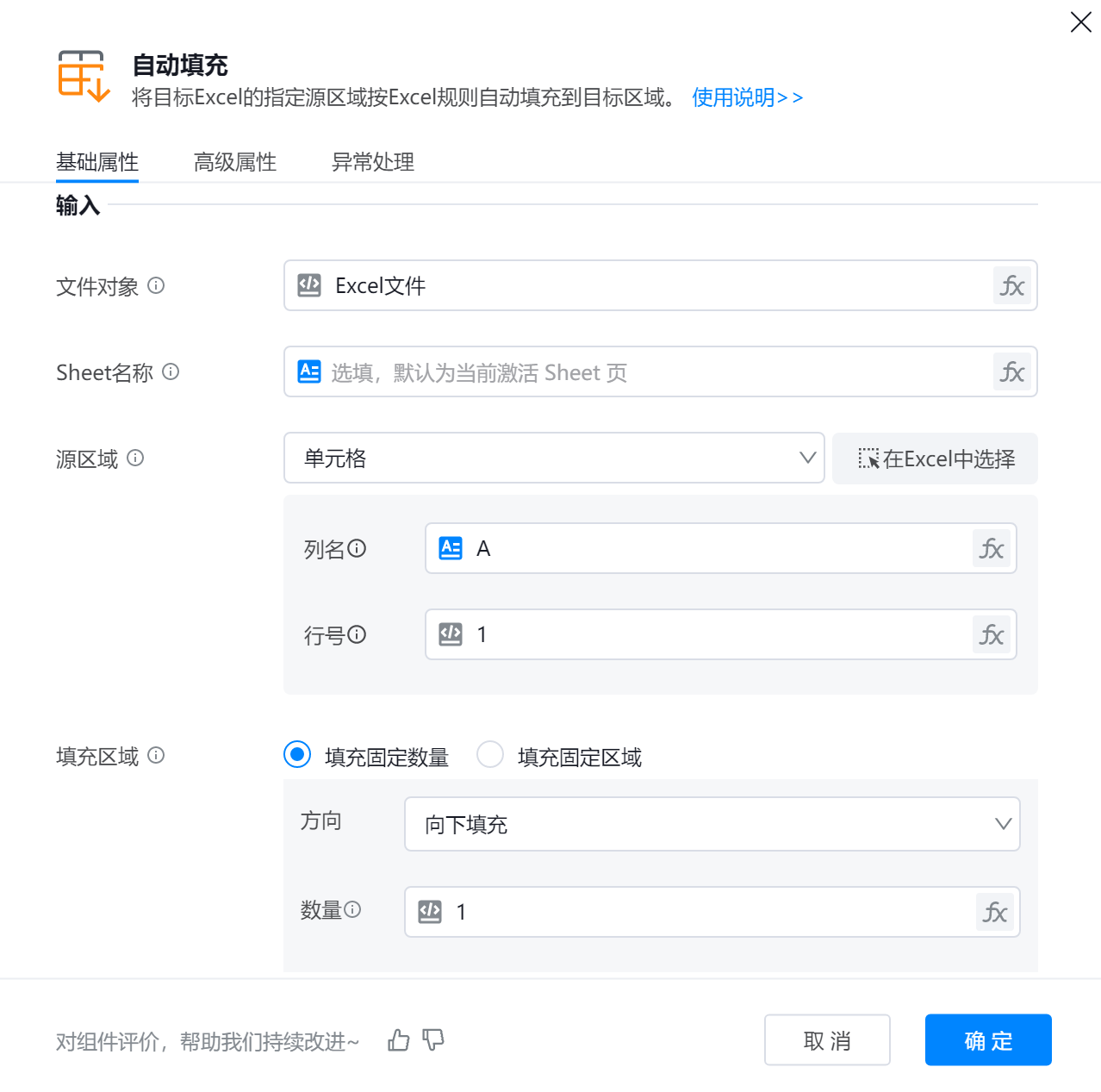● 填充区域:待填充数据的表格区域。可选择填充固定数量(向下填充、向右填充、向上填充、向左填充)或填充固定区域(指定区域的行号和列名)。