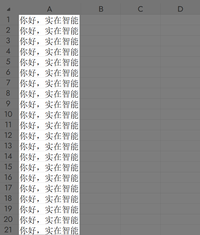 成功向下填充20个”你好,实在智能“;在输出区域显示成功。