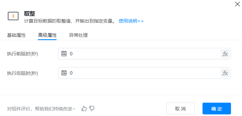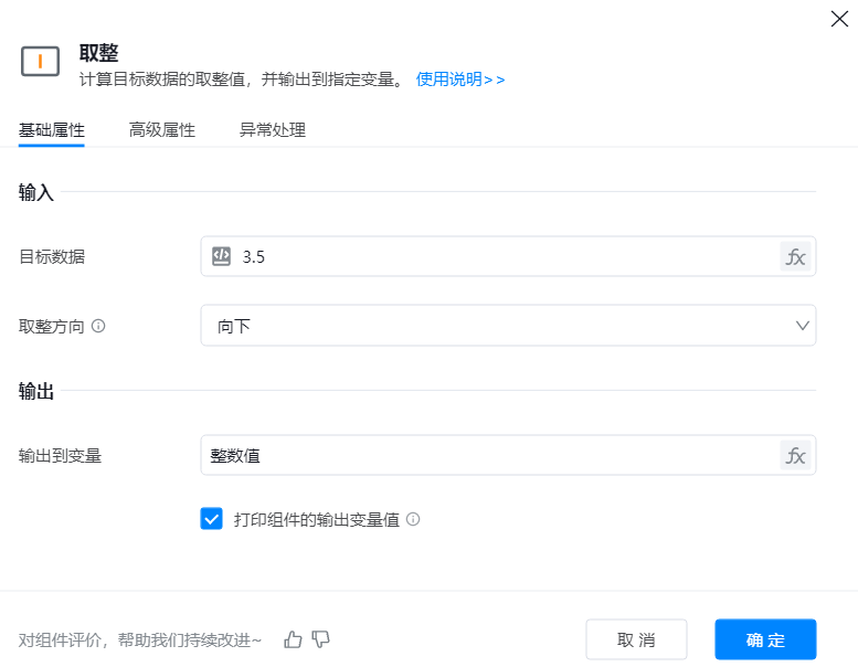 添加组件到可视化编辑区,在属性框中输入目标数据,并选择取整方向;运行组件,将计算结果赋值到变量。