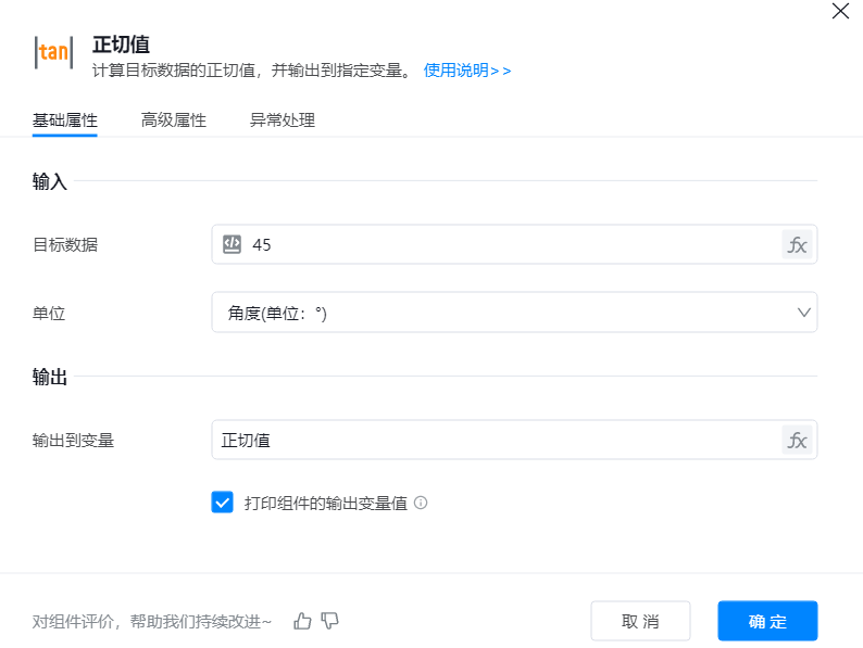计算目标数据的正切值,并输出到指定变量。