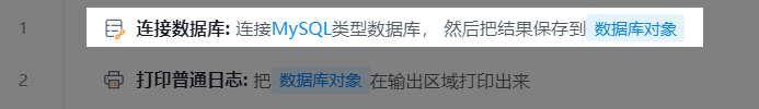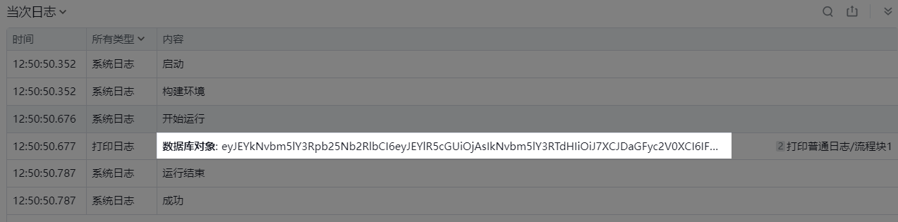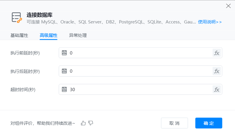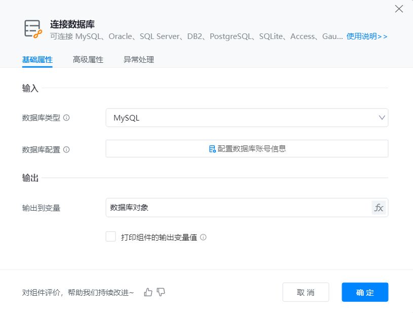 执行逻辑:添加此组件到可视化编辑区。设置数据库属性完成后运行组件,并返回数据库对象到变量。如下图所示: