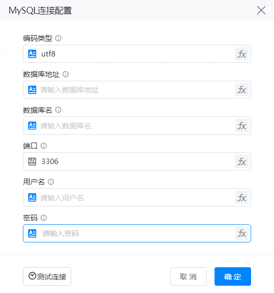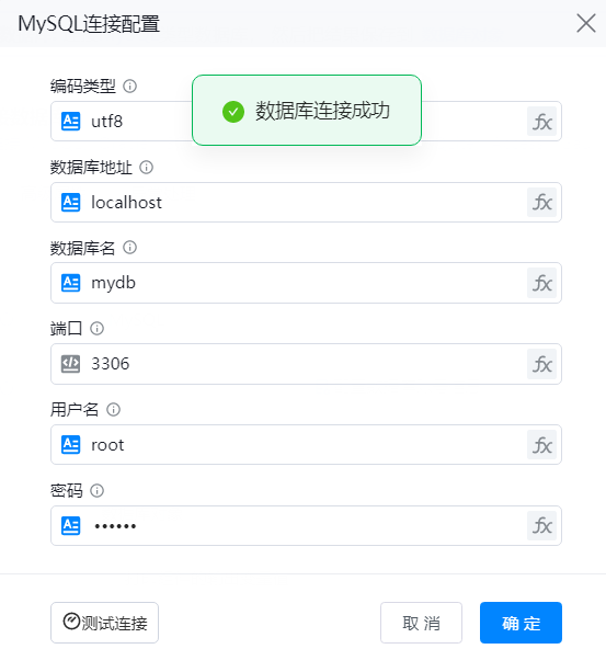 注:将编码类型、数据库地址、数据库名、端口、用户名、密码输入后,点击“测试连接”,出现“数据库连接成功”则连接成功,否则连接失败。