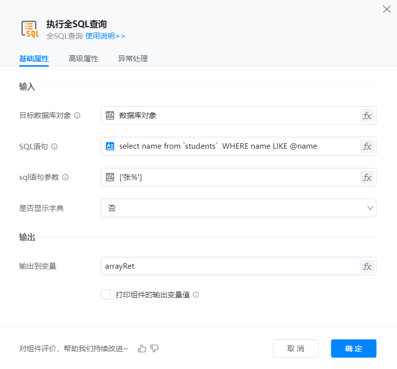 ● 目标数据库对象:输入数据库对象的变量名称,如前面【连接数据库】组件中打开的数据库。