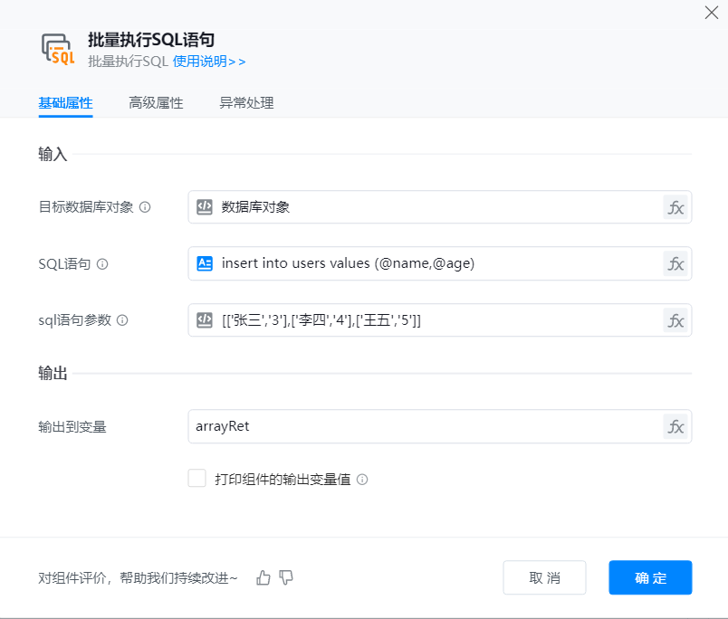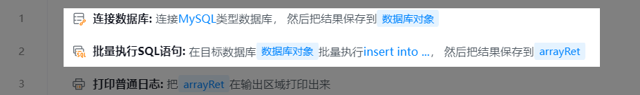 在目标数据库中批量执行SQL语句,返回受影响的行数。需要结合【连接数据库】组件一起使用。