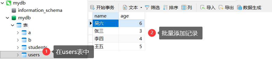 例如:在表名为users的表中批量插入三条数据,name字段的值分别为张三、李四、王五,age字段的值分别为3、4、5。