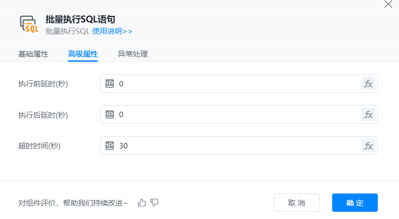 2、连接成功后,继续添加【批量执行SQL语句】组件到可视化编辑区,在右侧或双击组件后的属性框中,配置该组件各参数。