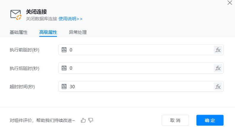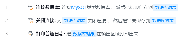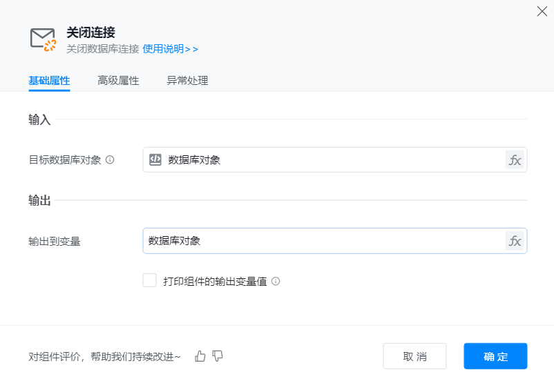 添加此组件到可视化编辑区,在属性框中选择需要关闭的数据库对象的变量名称,运行组件,数据库连接关闭。