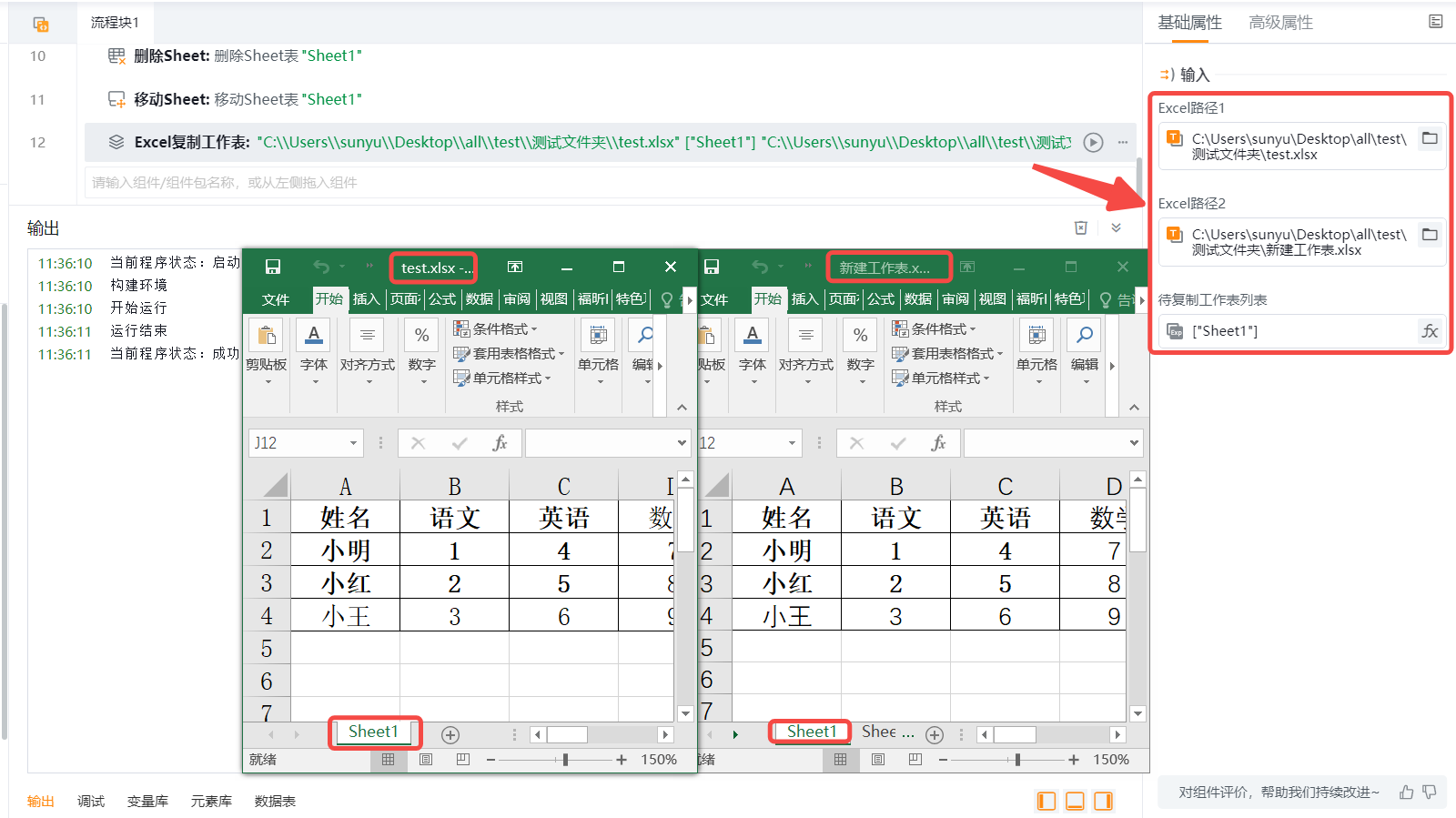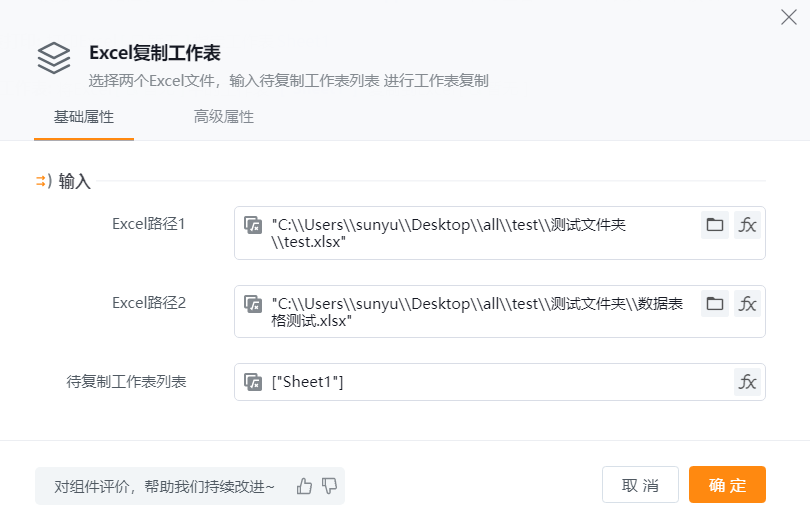 添加组件,在属性中输入各项参数。如将目标Excel文件(test.xlsx)的Sheet1工作表,复制到目的Excel文件(新建工作表.xlsx)中。