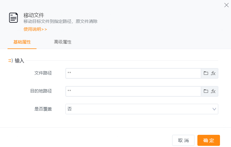 ● 是否覆盖:可选是、否。当选择是,则指定路径下有同名文件存在时,会删除原有文件并移动目标文件到指定路径;当选择否,则指定路径有同名文件存在则不移动源文件。