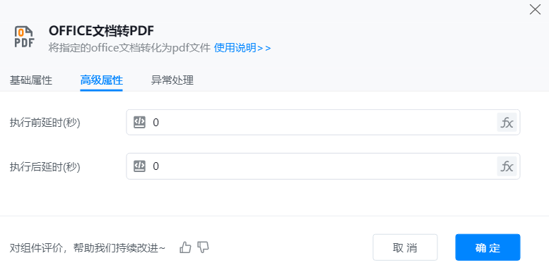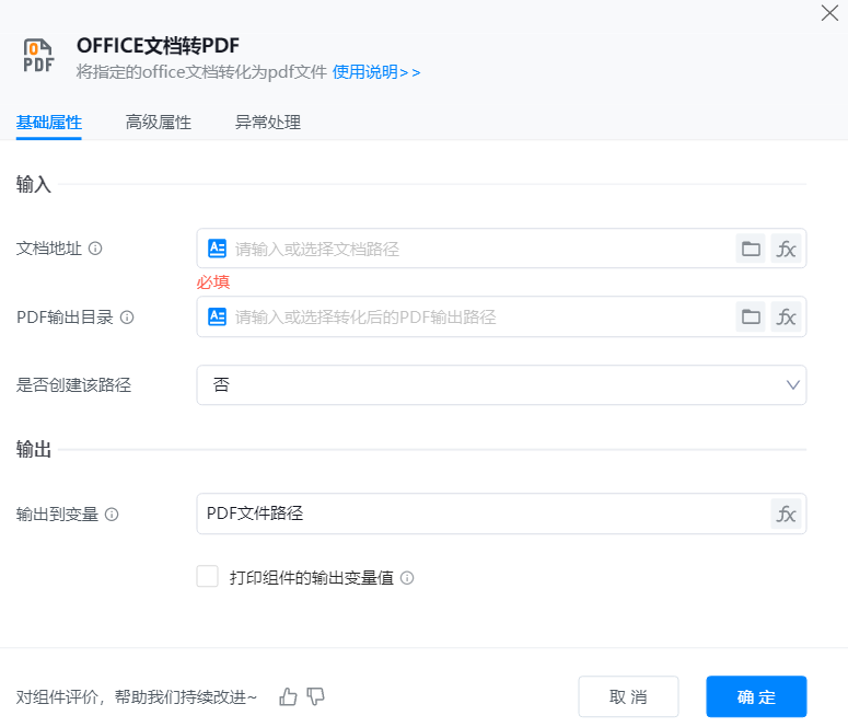 ● 文档地址:需要转换为PDF的OFFICE文件路径,可以点击右侧“小文件夹按钮”手动选择文件夹或者点击”fx“选择已保存的文件夹变量。