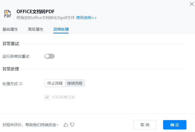 ● 异常重试:当流程运行过程中发生异常时,可根据实际需求配置是否启用重试逻辑。