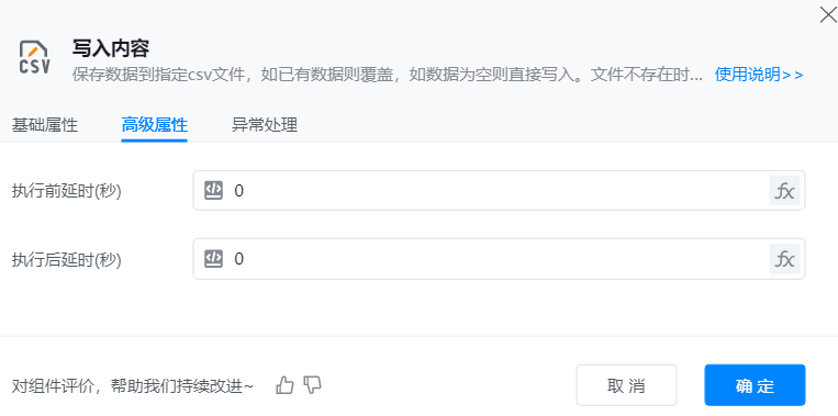 ● 文件路径:CSV文件的所在路径,可以点击右侧“小文件夹按钮”手动选择文件夹或者点击”fx“选择已保存的文件夹变量。