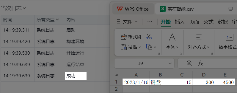 例如:在”实在智能.csv“中写入[["2023/1/16","键盘","15","300","4500"]]这样一个数据表对象。