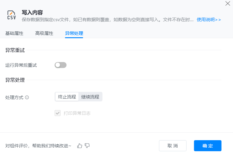 ● 异常重试:当流程运行过程中发生异常时,可根据实际需求配置是否启用重试逻辑。