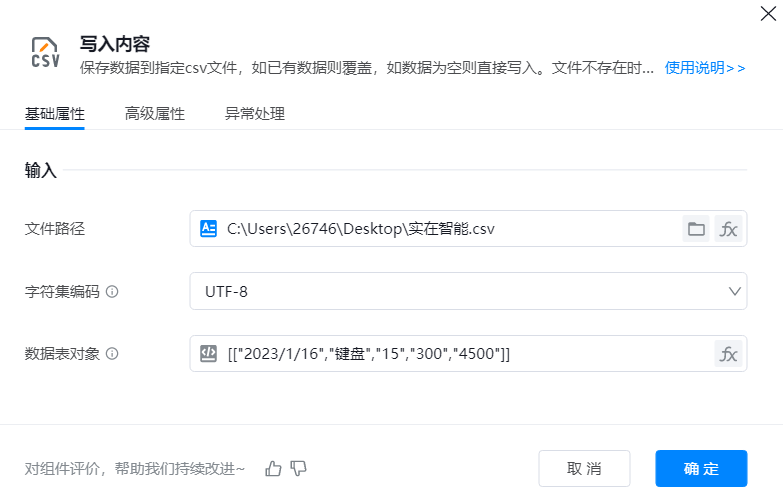 使用【写入内容】组件将数据表对象中的内容,写入到目标csv文件中。