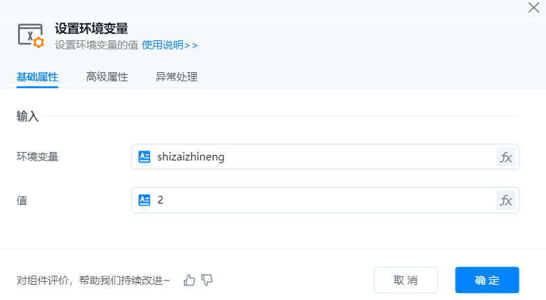 添加【设置环境变量】组件到可视化编辑区后,在属性框中的“环境变量”处输入系统中已有的变量项名称,在“值”处输入需要设置的值。