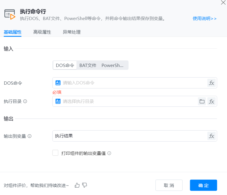 ● 执行目录:执行命令的根目录,为空时,默认流程所在根目录。可以点击右侧“小文件夹按钮”手动选择文件夹或者点击”fx“选择已保存的文件夹变量。