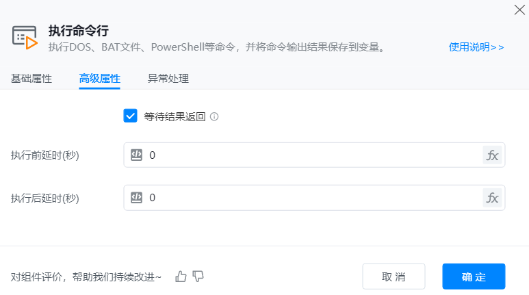 ● 等待结果返回:为了防止部分命令没有返回值但一直在等待的情况,可以选择不勾选,组件将返回None。