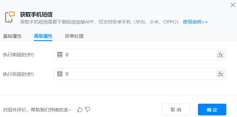 添加【获取手机短信】组件到可视化编辑区,并配置其基础属性。