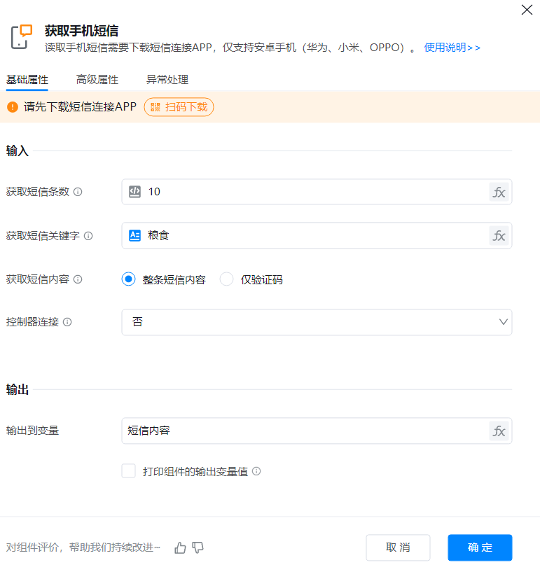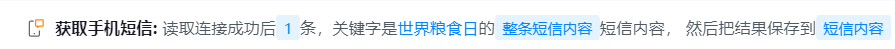 ● 输出到变量:将手机短信内容输出为数组,并赋值到变量,以便在后续步骤中动态获取和使用这些信息。