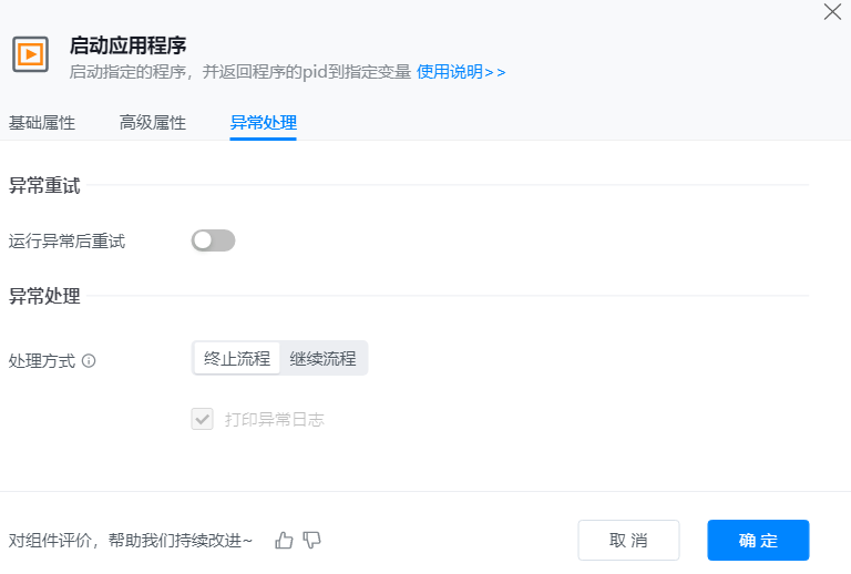 ● 异常重试:当流程运行过程中发生异常时,可根据实际需求配置是否启用重试逻辑。