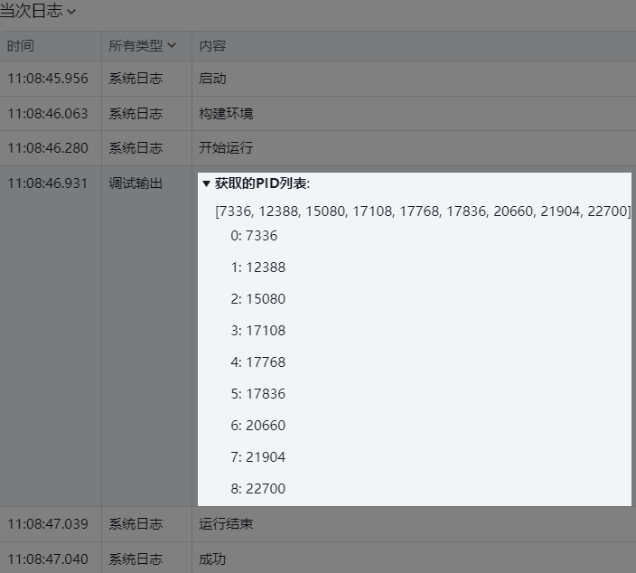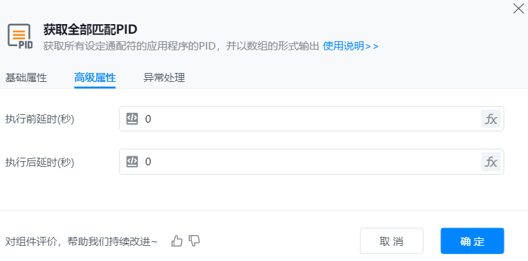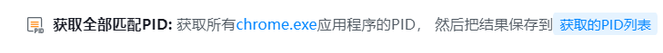 ● 输出到变量:用于保存获取到的正在执行且符合通配符的所有应用程序的pid的列表变量,以便在后续步骤中动态获取和使用这些信息。