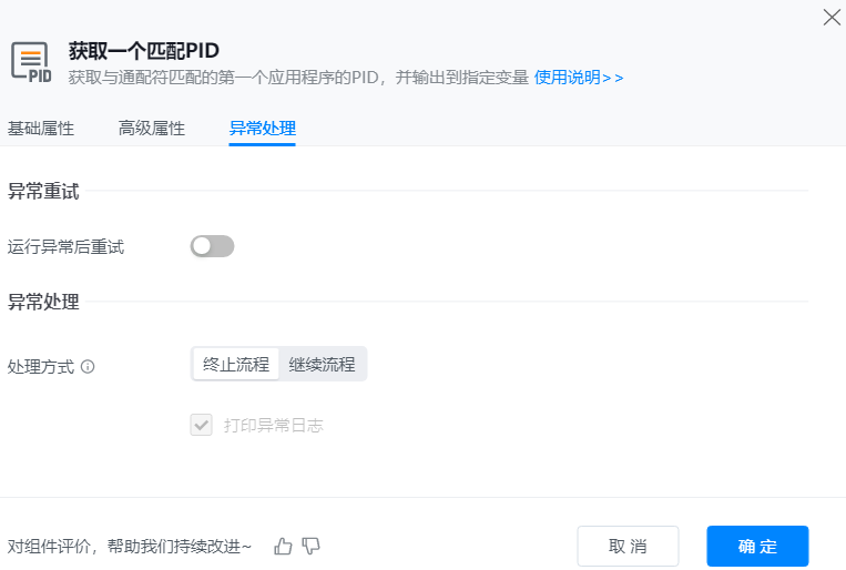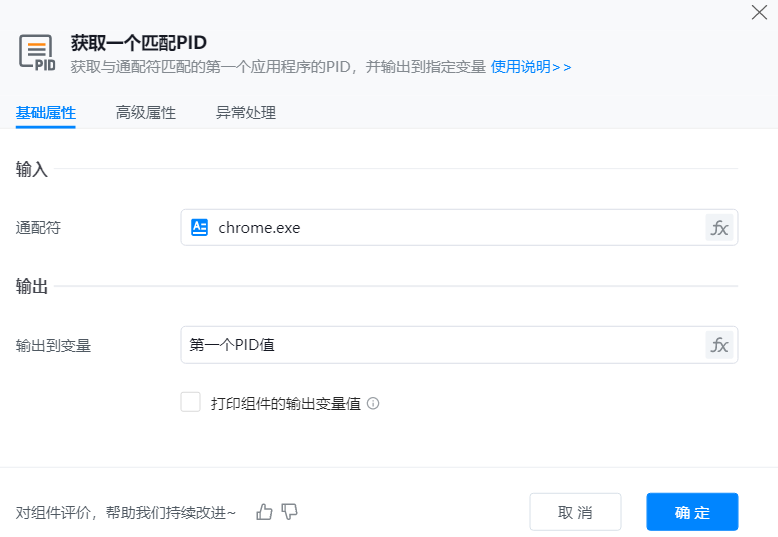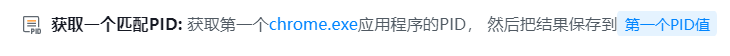 ● 输出到变量:用于保存获取到的正在执行且符合通配符的第一个应用程序的PID的变量,以便在后续步骤中动态获取和使用这些信息。