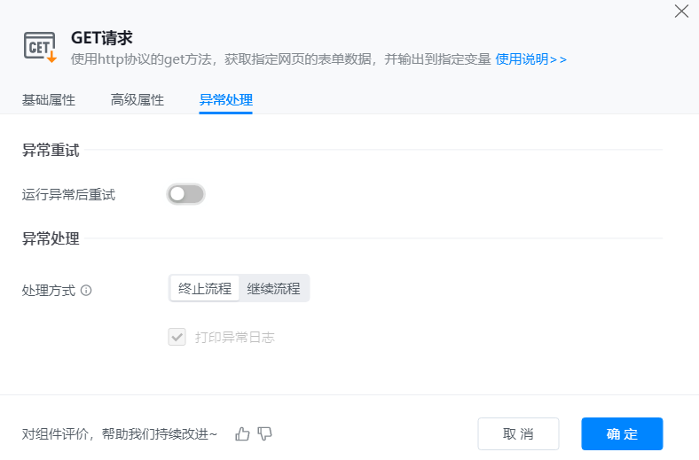 ● 异常重试:当流程运行过程中发生异常时,可根据实际需求配置是否启用重试逻辑。