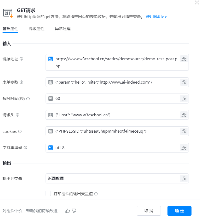 ● 请求头:设置http协议头,格式为"协议头名称": "协议头内容",,可为空{}或填写具体参数。示例:{"Host": "www.w3cschool.cn"}。