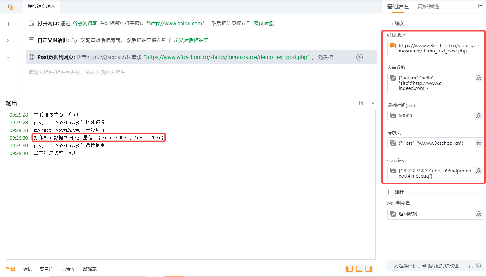 使用http协议的Post方法,将数据提交到指定网页的表单中,并输出到指定变量。