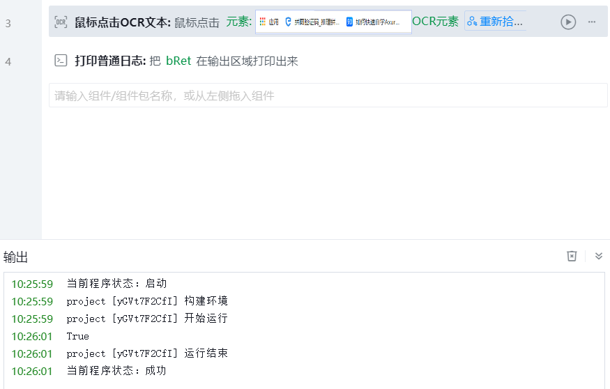 调用本地服务对屏幕中的指定区域进行OCR识别,将识别出的信息和用户指定的文本进行匹配,匹配成功则点击该文本,并输出匹配结果到指定变量。