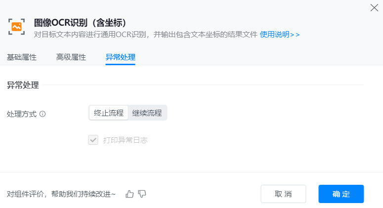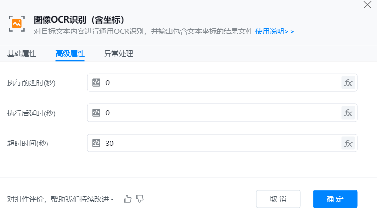 添加【图像OCR识别(含坐标)】组件到可视化编辑区,并配置其基础属性。