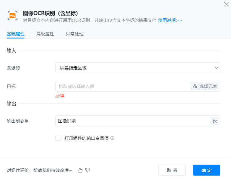 ● 输出到变量:输出识别结果(包括坐标信息),赋值到变量,以便在后续步骤中动态获取和使用这些信息。
